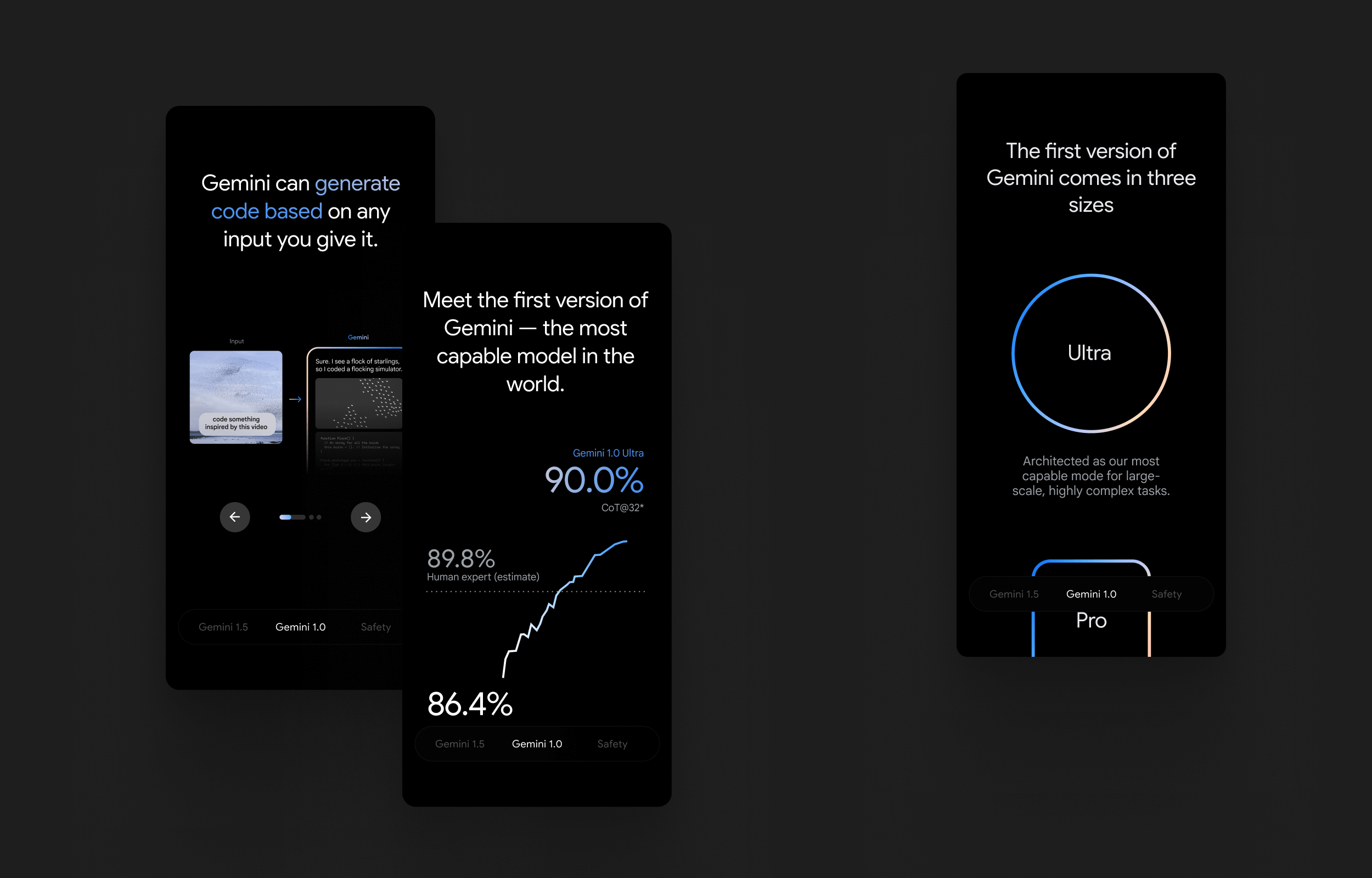 Gemini is built from the ground up for multimodality, reasoning seamlessly across text, images, video, audio, and code. This family of models surpasses state-of-the-art performance on a range of benchmarks, and consistently outperforms human experts on massive multitask language understanding. Upperquad worked closely with Google DeepMind, Brand Studio and Creative Labs to develop a new brand and website introducing the Gemini Era.