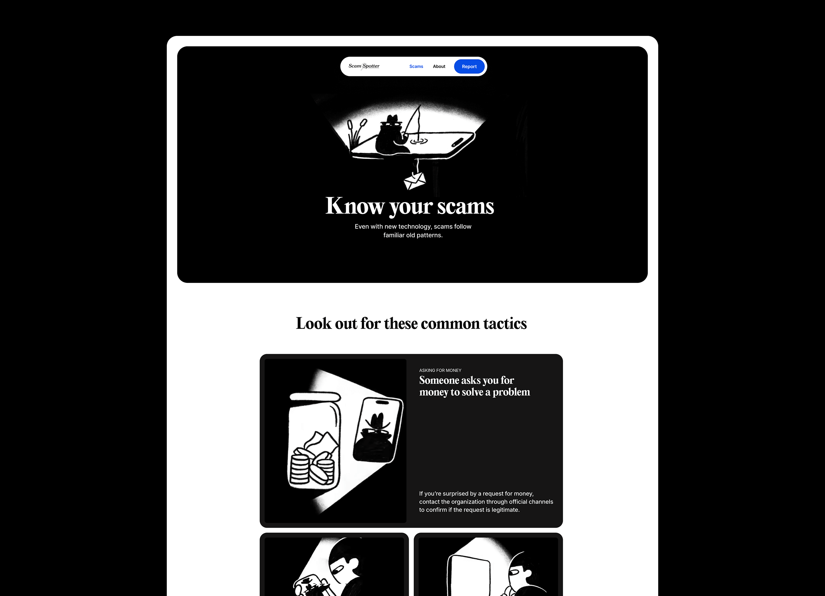 Scam Spotter is a consumer outreach initiative from FightCybercrime and Google to help fight scams. Its goal is to raise awareness, provide easy to understand information and stop people from getting scammed. We worked alongside Sandy Russell Creative to create the brand identity, website, and a series of animated videos to bring the initiative to life.