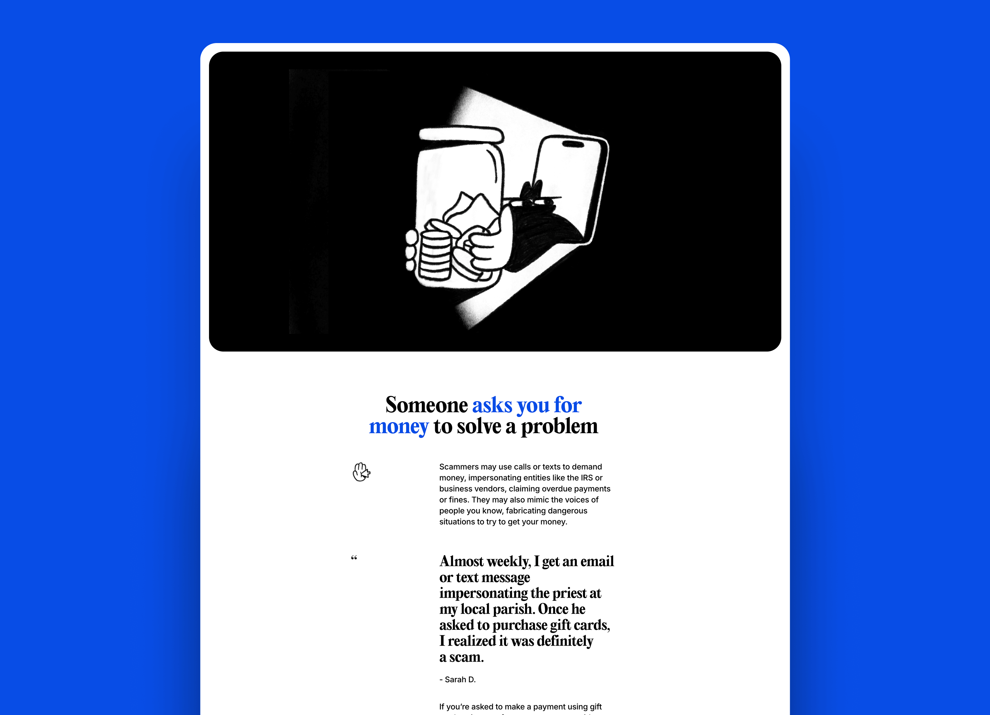 Instead of focusing on the worst case scenarios, we focused on everyday avoidance of scams. We wanted to prepare people to spot a scam, no matter what form it might take. No scare tactics. Just smart habits.