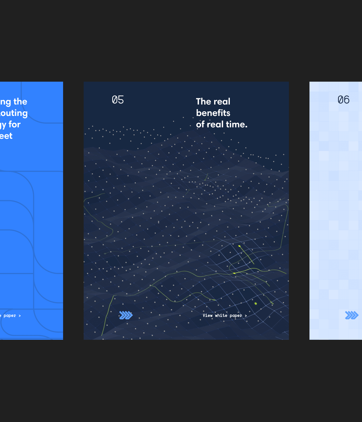 At the core of Wise Systems’ platform is a AI-driven dynamic optimization engine that continuously ingests data from operations, makes real-time decisions and uses machine learning to get better over time. Route optimization algorithms make intelligent routing decisions for a fleet. We wanted to represent this complex process in an intuitive visual system, showing movement through time, space and constantly changing conditions.