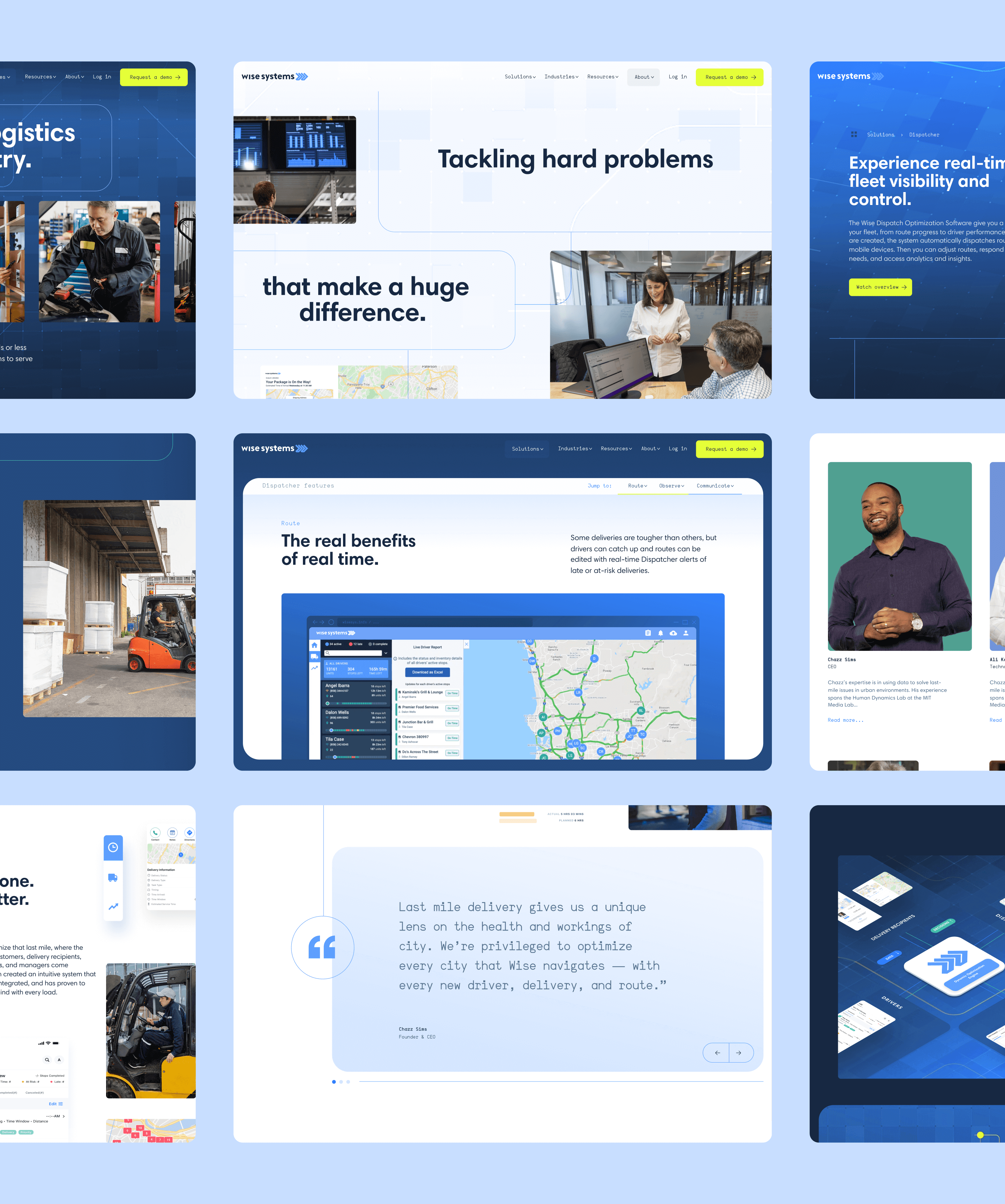 Wise Systems set out to optimize that last mile, where the expectations of customers, delivery recipients, drivers, dispatchers, and managers come together. We worked closely with their team to create messaging, headlines and copy that clearly gets the point across, while being mindful of their core audiences.